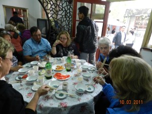 Next stop – Temple of Heaven, well it is where the emporer goes to pray….nothing to exciting here except we can say we were in “Heaven”. I will say that we were celebrities again here, people with children wanting us to have pictures with them. I held a baby boy and he kept touching my cheek, I gave him an american quarter and you would think it was gold, apparently it will bring the boy good luck. We walked thru the gardens and arrived at a student gallery. Upon entering we were all wondering why would we come here, within minutes we were served tea and had a lovely student tell us about all the art work….next thing you know we all had purchases, or most of us did anyways.